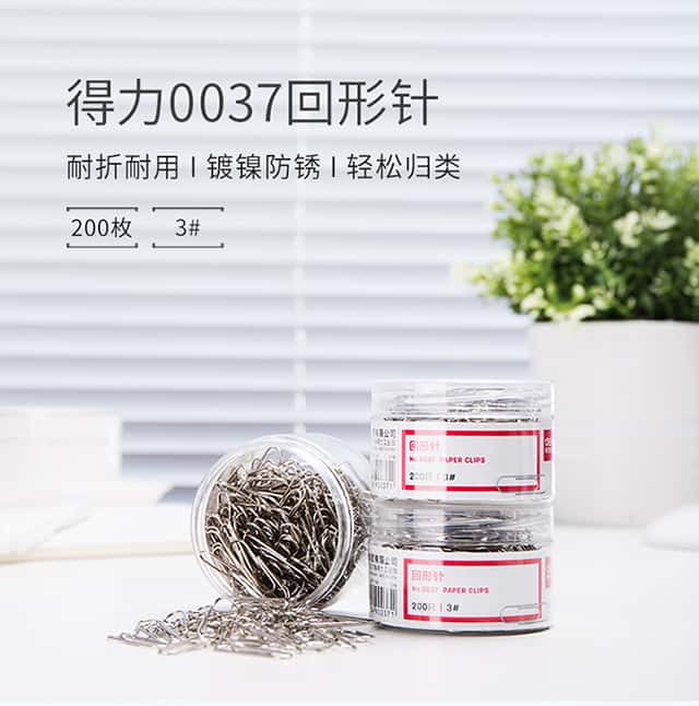 得力(deli)29mm镀镍回形针3#金属曲别针200枚/筒办公用品0037