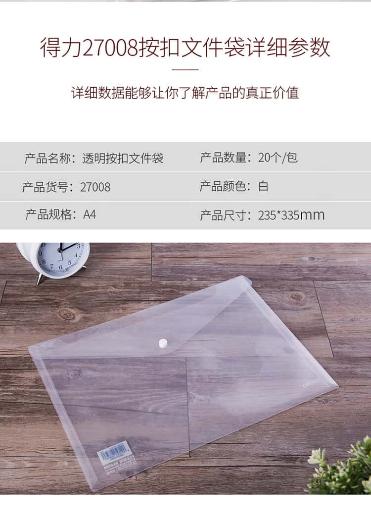 文具得力(deli)20只A4按扣学生桌面透明文件袋试卷收纳文件套学科分类塑料防水档案袋27008