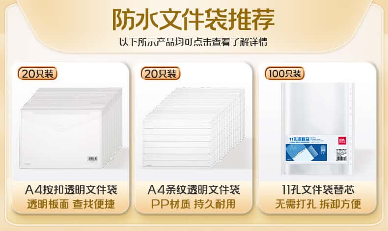 文具得力(deli)20只A4按扣学生桌面透明文件袋试卷收纳文件套学科分类塑料防水档案袋27008